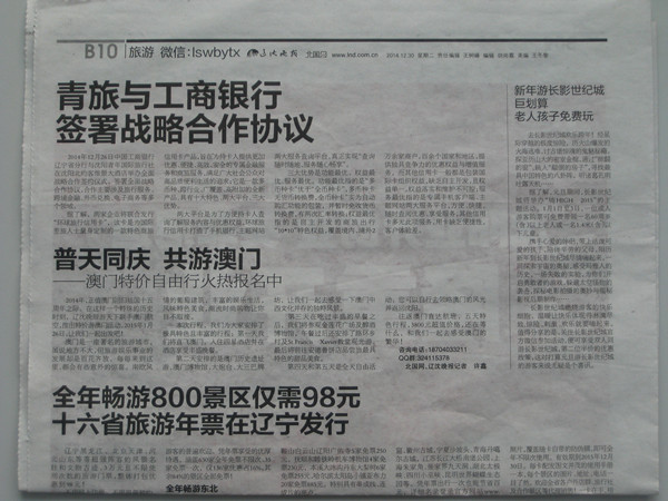 2014年12月26日中國工商銀行遼寧分行與沈陽青年國際旅行社在沈陽北約客維景大酒店舉辦全面戰(zhàn)略合作簽約儀式,簽署全面戰(zhàn)略合作協(xié)議,合作主要涉及旅行服務、跨境金融、外幣兌換、電子商務等多個領域。兩家企業(yè)將聯(lián)合發(fā)行“環(huán)球旅行信用卡”,該卡是為國際差旅人士定制的商旅信用卡!